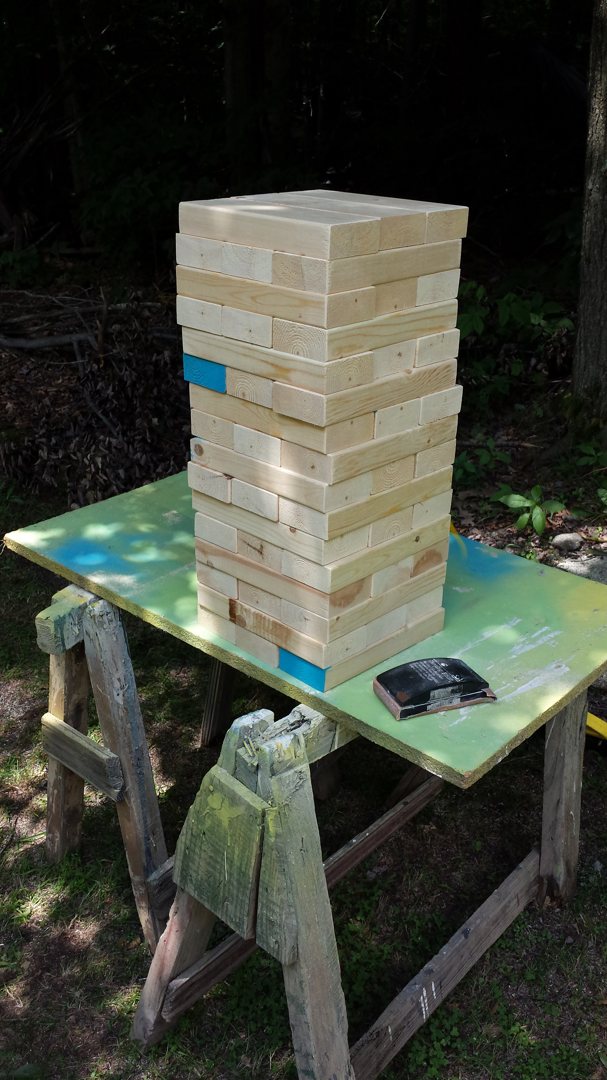 The whole thing cost me $18.00. I purchased 6 2x4x8 pieces of wood (make sure they aren’t cracked). The next step was just cutting them into 10.5 inch pieces (you’ll need 48 altogether, for 16 rows of three). All I did afterwards was sand the edges to make sure everything was smooth. My dad and I did this on a Saturday afternoon and it took us less then an hour. Really, this is easy for anyone, as long as you have a roommate/father with a nice cache of tools. Otherwise, most lumber stores will cut the pieces for you. You could always paint the blocks (we opted to go for a more rustic, i.e. lazy look), but if you opt for that I’d recommend sticking to the ends only. I might make another set and do it up red, white, and blue-you could never have enough patriotic gear lying around. I might also do a white trash version where every block has a hidden drinking dare on it. Who knows?